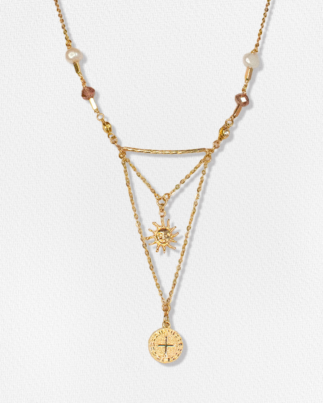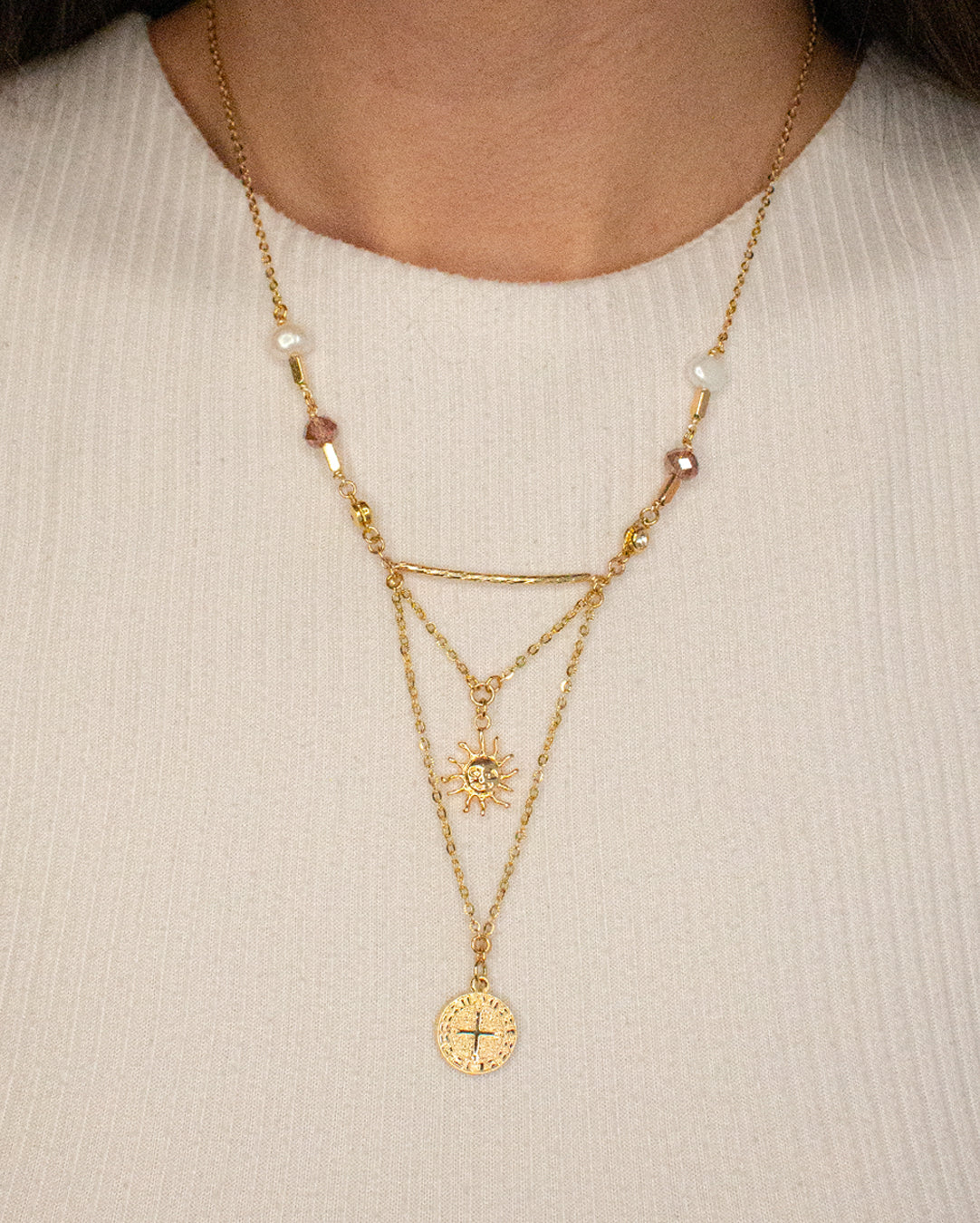 Collar doble, con dije de sol, san benito y perla de rio.